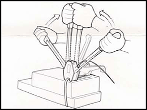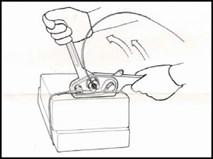 3. Hold the tool with your left hand and move the handle back and forth with your right hand, until the strap is tensioned. |