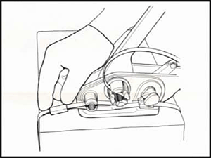 1. Place the strap around container as shown, take the tensioner in your hand and depress the tension lever, place the strap under the gripper and the bottom section of cutter housing, the end of strap should protrude 2" beyond the tool, release the tension lever. |